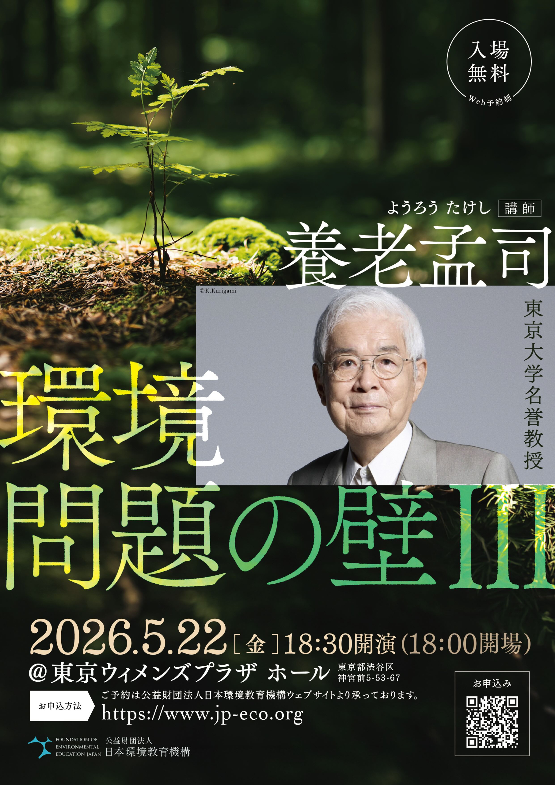 SEMINAR INFOMATION セミナー情報参加費:無料 テーマ 養老孟司氏 特別講演「環境問題の壁Ⅲ」 講師 養老孟司 東京大学名誉教授 日時 2026年5月22日(金) 18:30~ (開場 18:00) 会場 東京ウィメンズプラザ ホール 東京都渋谷区神宮前5-53-67 詳細・お申し込みはこちら